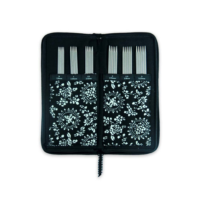 This Stainless Steel Double Point Sock Set includes six sets of 6" (15 cm) double points in sizes US0 (2.0 mm), US1 (2.25 mm), US1.5 (2.5 mm), US2 (2.75 mm), US2.5 (3.0 mm) & US3 (3.25 mm), 12 stitch markers, a 5" (13 cm) needle gauge, and a compact, zipper-enclosed fabric case with an outside, zippered pocket and red ribbon detail.