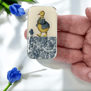 This handcrafted notions tin features a storybook-inspired design of a duck in a tiny raincoat, wandering toward a hyacinth atop delicate blossoms.