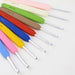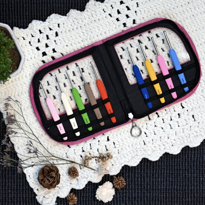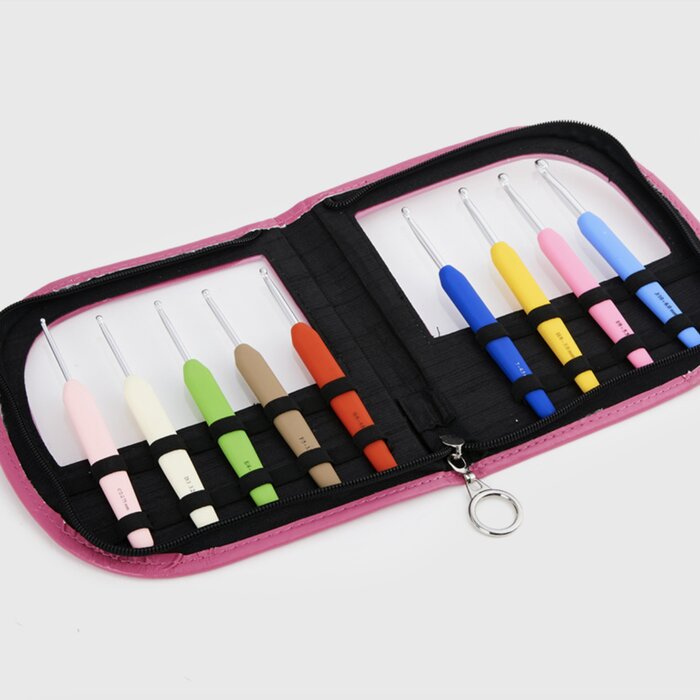This collection of single ended crochet hooks contains 9 color-coded sizes, all neatly packaged in a bright pink leather-like case, with a vinyl window. Now you can carry a complete set along for the ride.