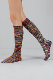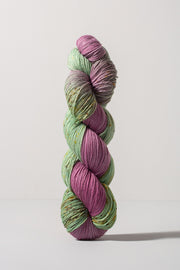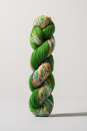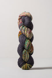 An intriguing combination of saturated solid plus exuberant speckled color, creating stripes that dance across needles and hooks in rhythmic combinations. A delightful challenge to combine Carmen into 'engineered’ projects that purposely plan stripe placement.