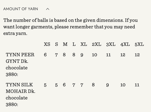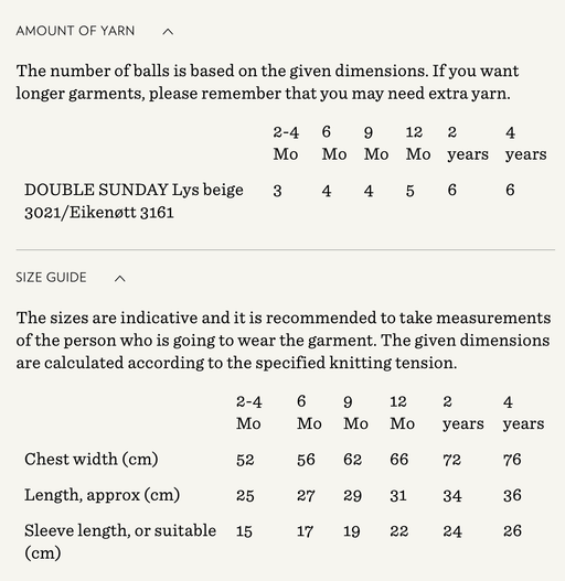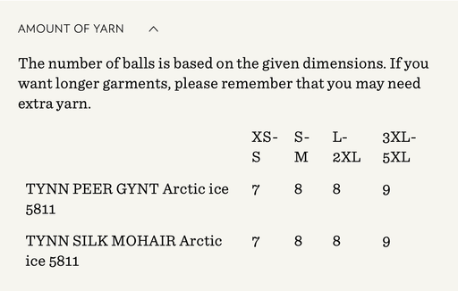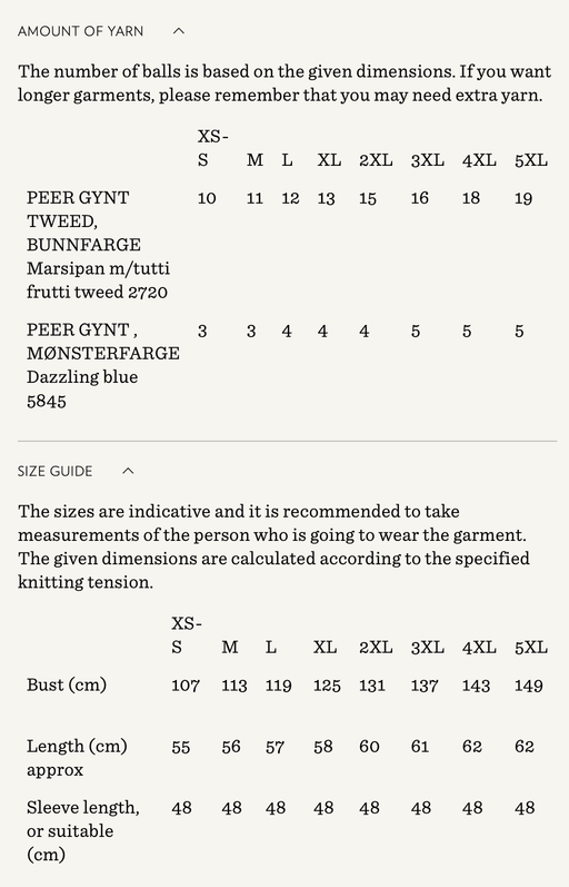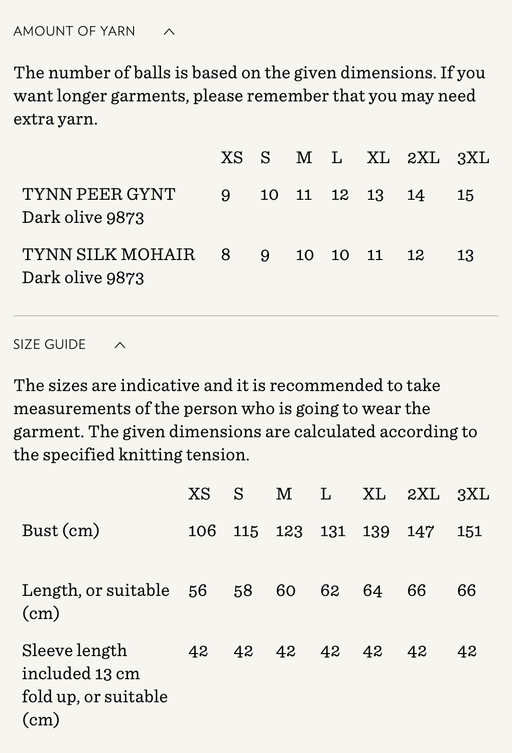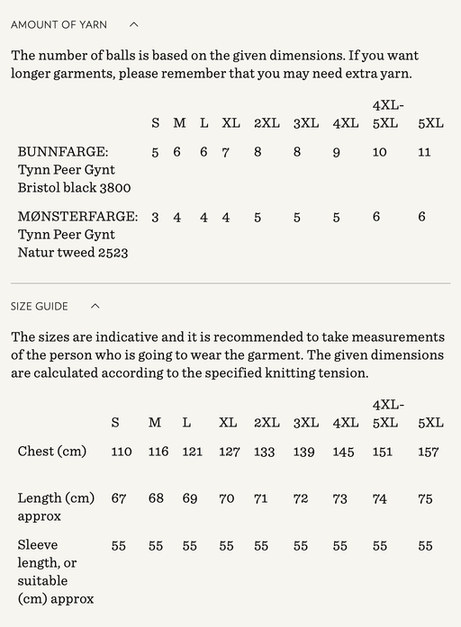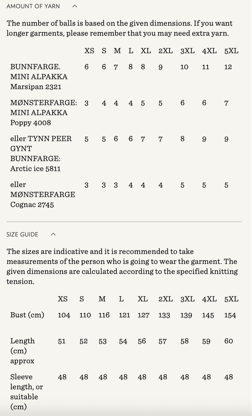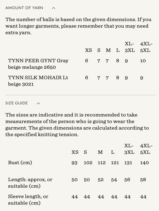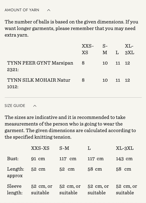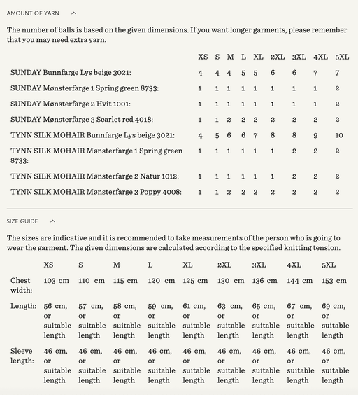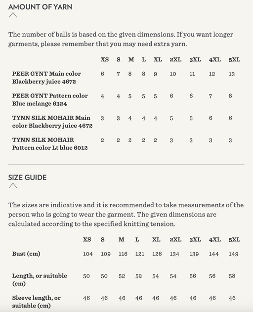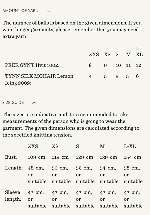 Sandnes GarnYarn requirements and size guide in photos. The model is 179 cm tall and wears a size S-M. Supplies Needed Yarn: DK (1 strand of Tynn Peer Gynt...