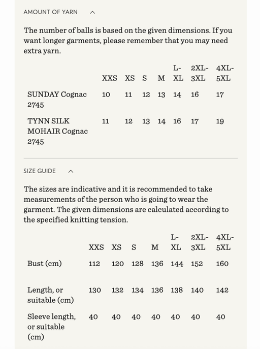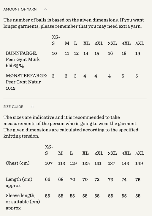 Sandnes GarnYarn requirements and size guide in photos. The model is 179 cm tall and wears a size M-L. Supplies Needed Yarn: DK (1 strand of Tynn Peer Gynt...