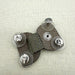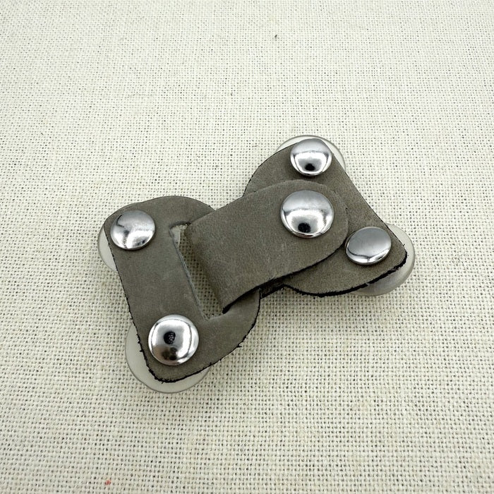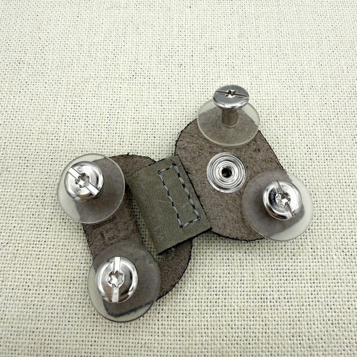 This new version of the Lock Toggle is made of light-weight leather perfect for fingering weight yarns. This leather closure screws into knitted, crocheted, handwoven, and sewn garments making it removeable for laundering and a striking alternative to conventional toggles, buttons, and frogs. The tongue on one side of the Lock comes up through the slot in the other side, doubles back on itself and 'locks' in place with a snap, making it extremely secure.